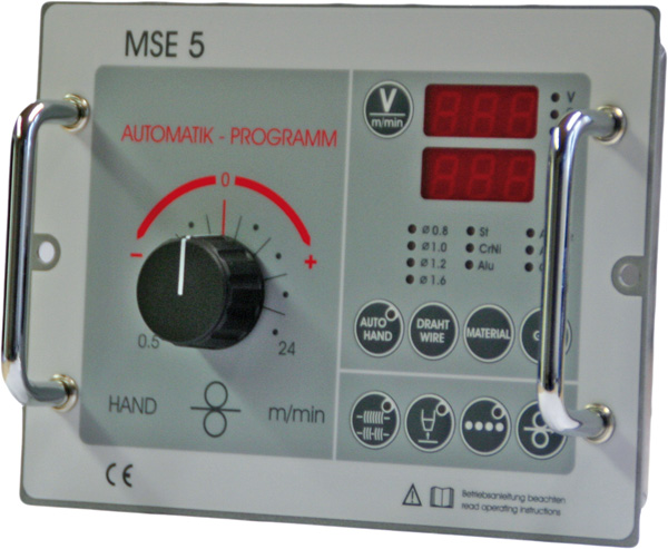 • Блок управления MSE5 с синергетическим управлением (одной ручкой), снабженный цифровым ампервольтметром и индикацией скорости подачи проволоки